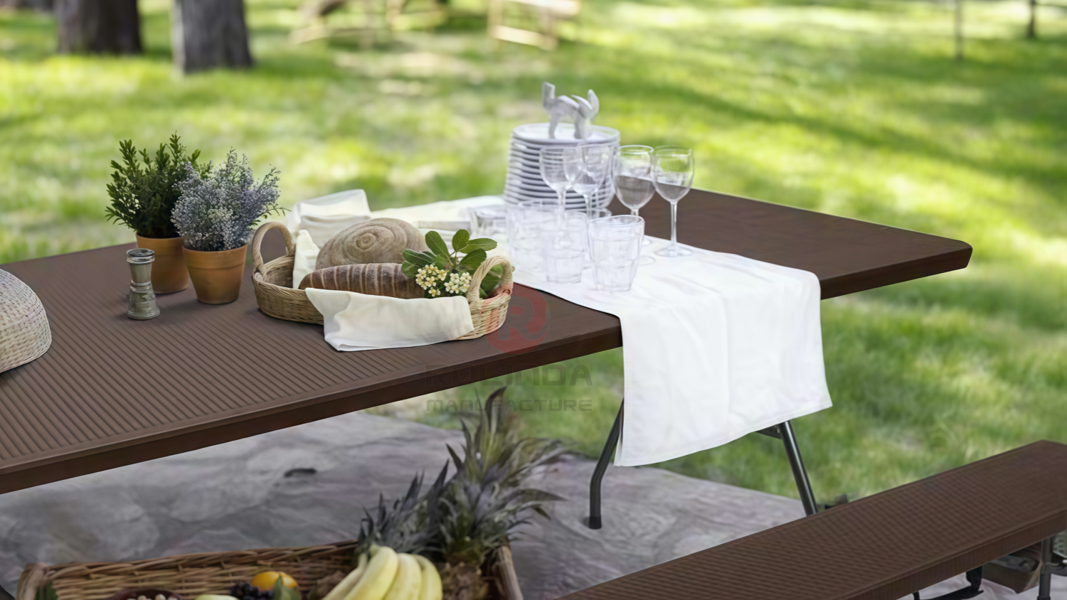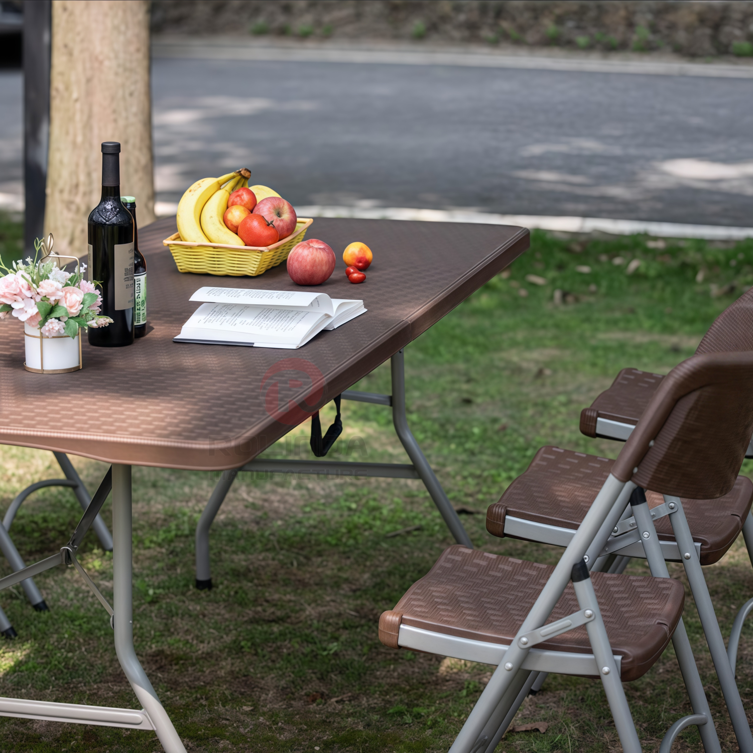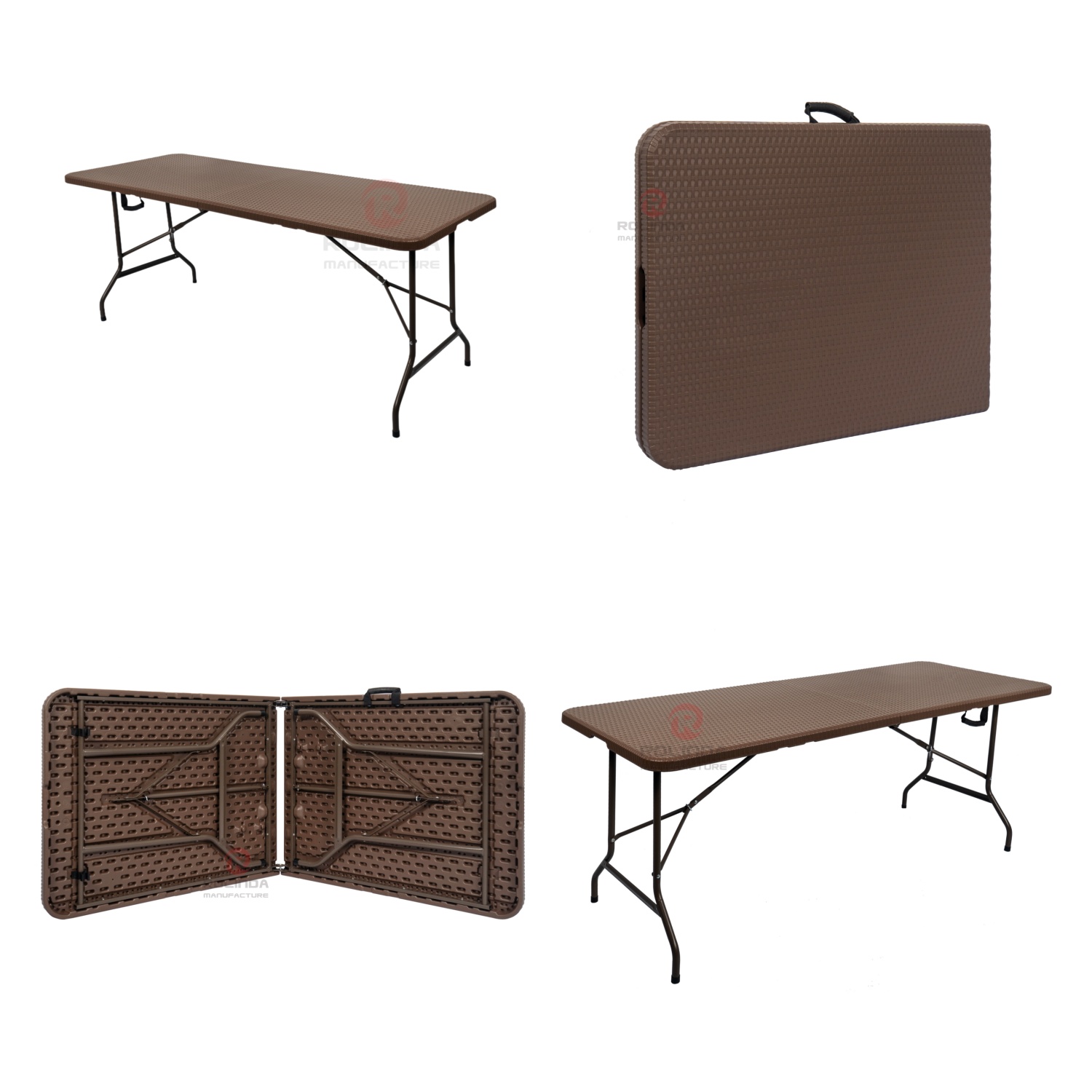 6Ft Rattan-Style Half-Folding Table: 3.5cm HDPE & 22mm Steel Frame This folding table blends realistic rattan texture (HDPE panel) with a space-saving half-fold design. A 3.5cm thick HDPE top and 22×1.0mm powder-coated steel frame make it durable, portable, and perfect for outdoor patios, camping, or indoor temporary dining.